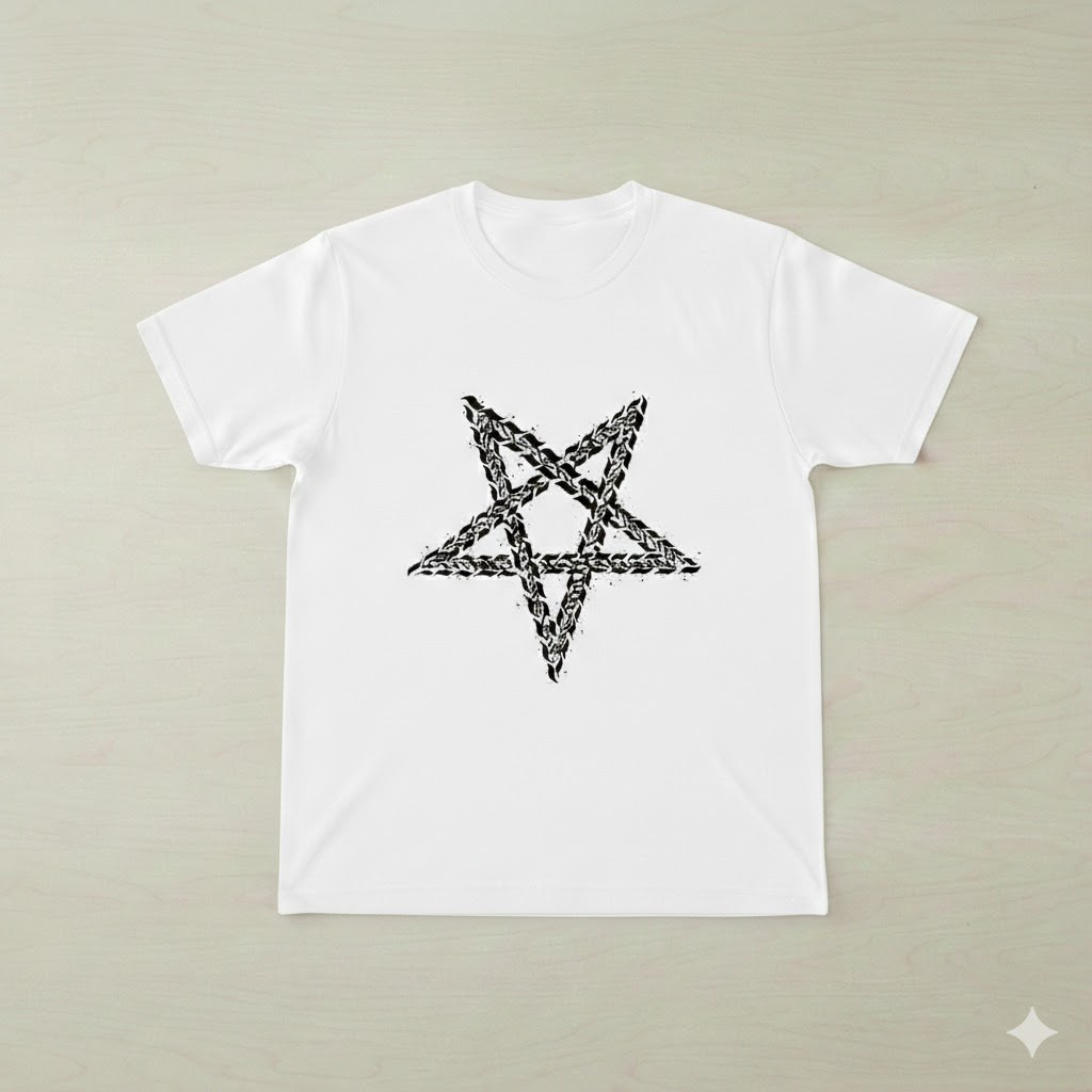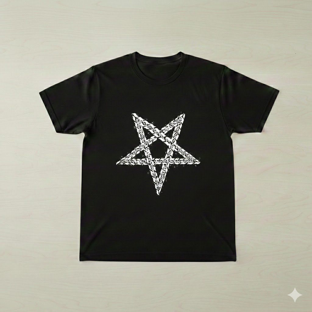 The ENAK pentagram design tee. Graffiti-style chain pentagram print on premium cotton. Available in Black or White. Each shirt is part of a limited drop.